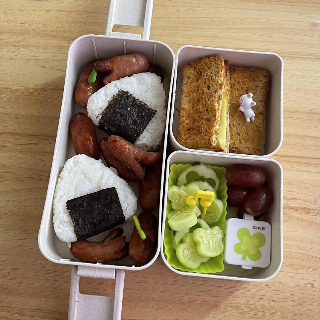 Dining & Cooking 10 months ago friday bento :3 Dining and Cookingfriday bento :3 - Dining and Cooking(Rice balls with mini sausages, grilled cheese, cucumber slices and grapes) #Bento