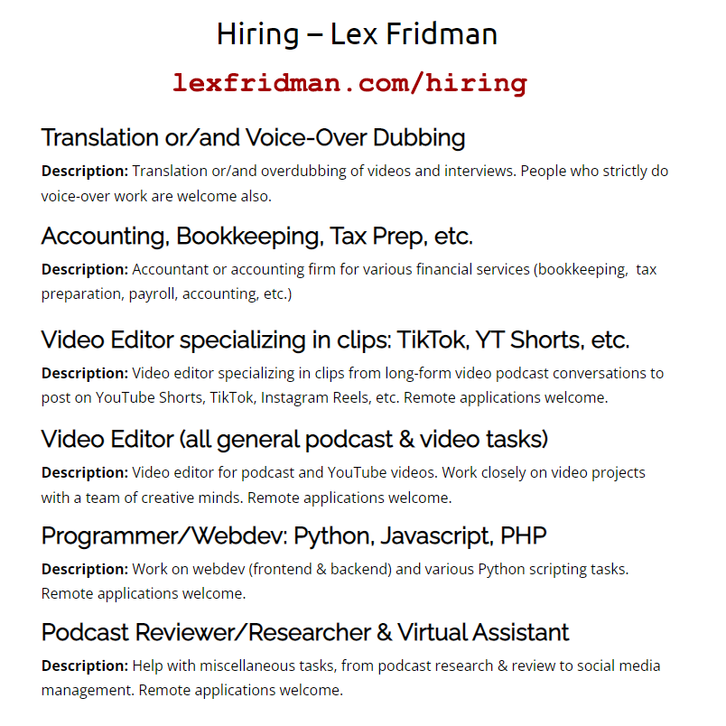 My name is Lex Fridman. I host a podcast. I am currently involved in several efforts, this page is about hiring for help with the podcast. Contact ...