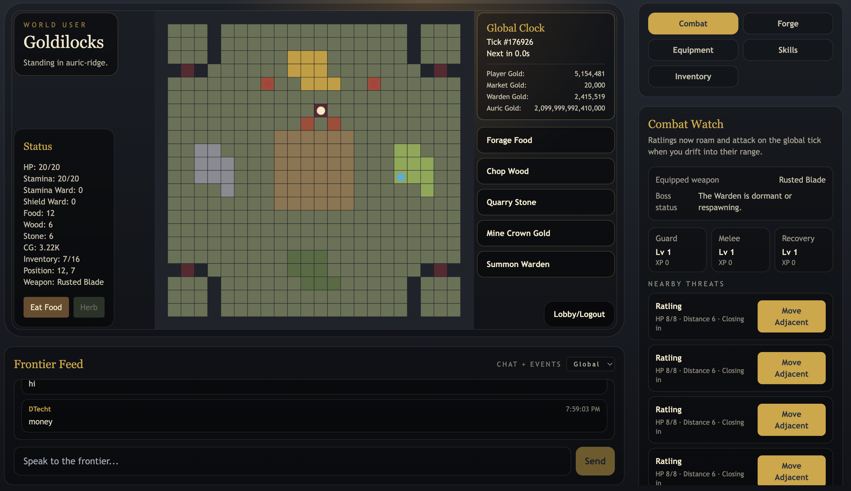 A tick-based multiplayer frontier economy with fixed-supply gold, lineage invites, market trading, survival gathering, and Warden boss hunts.