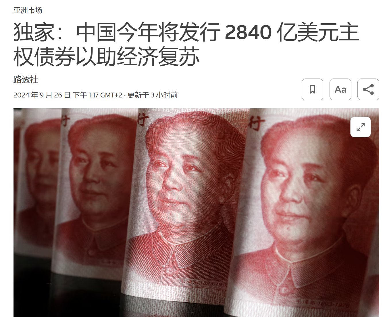 路透社消息,9 月 26 日,两位知情人士称,作为新一轮财政刺激措施的一部分,中国计划今年发行价值约 2 万亿元人民币(2844.3 亿美元)的特别主权债券,此举将进一步加大对通货紧缩压力和经济增长放缓的应对力度。