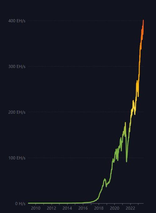 josearkaos 2 years ago X (formerly Twitter)Luke Mikic🇦🇺 The 9-5 Escape Artist🇦🇺 (@LukeMikic21) on XThe #Bitcoin hash rate is going absolutely parabolic, smashing through 400TH/s & another ATH!🚀 This is the 1st bear market where the hash r...