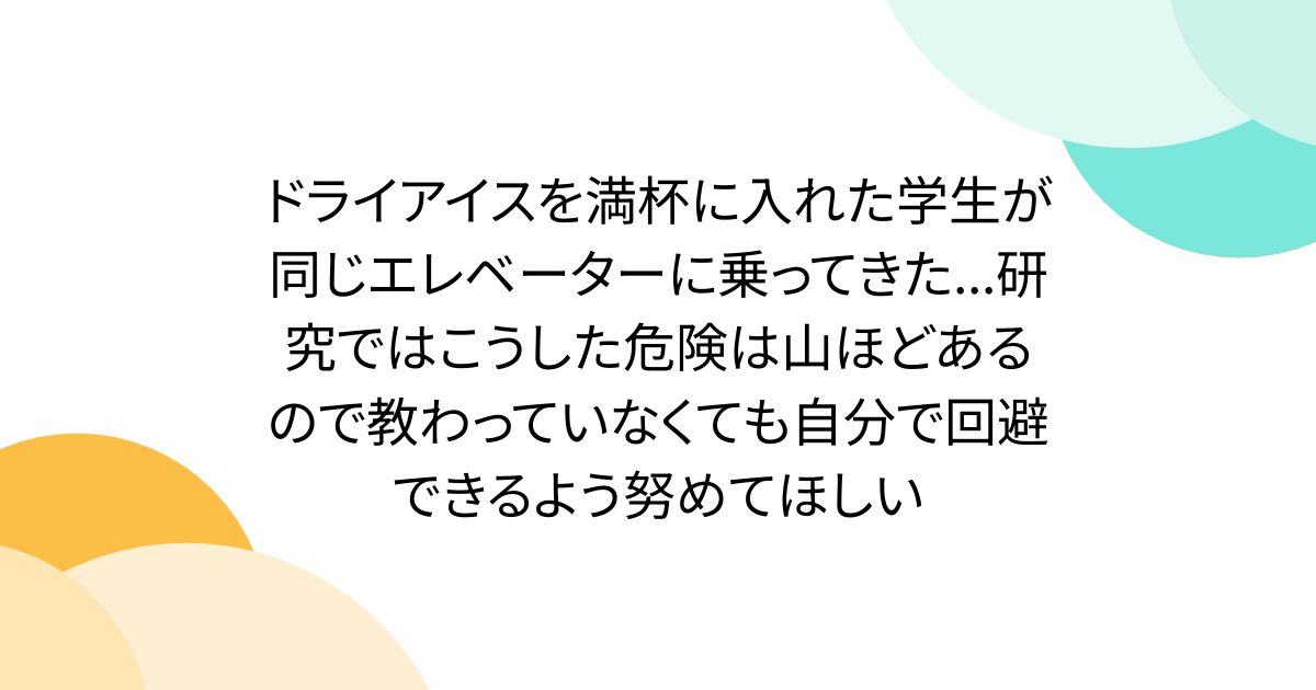兼本わたる 2 hours ago ドライアイスを満杯に入れた学生が同じエレベーターに乗ってきた...研究ではこうした危険は山ほどあるので教わっていなくても自分で回避できるよう努めてほしい Togetter [トゥギャッター]ドライアイスを満杯に入れた学生が同じエレベーターに乗ってきた...研究ではこうした危険は山ほどあるので教わっていなくても自分で回避できるよう努めてほしいドライアイスや液体窒素を満載した容器を人同乗のエレベーターで運ぶと一酸化炭素や二酸化炭素充満、窒息...
