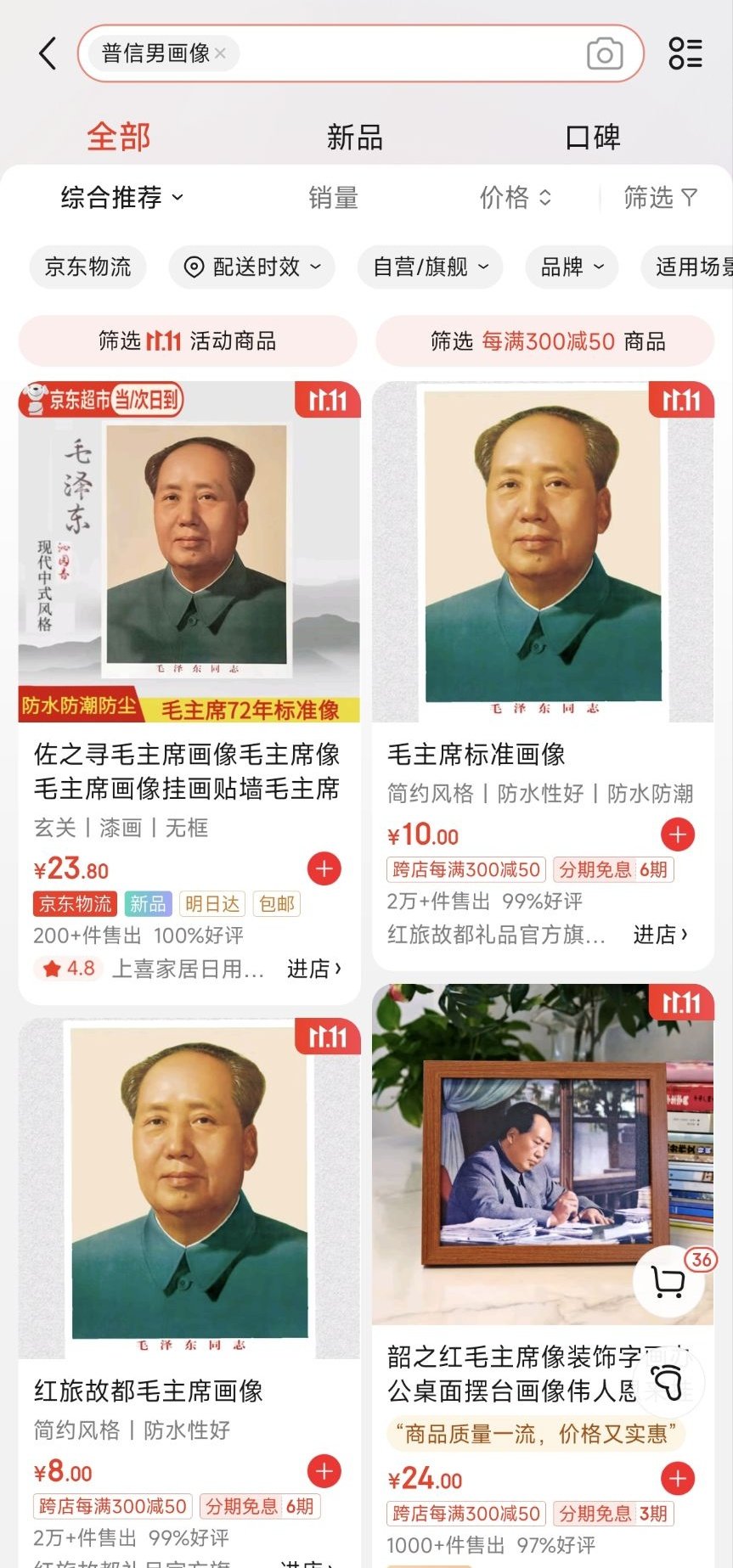 节目效果有了:有人在京东等电商平台上搜索“普信男画像”、“普信男著作”,得到了很多毛泽东相关的结果。更有甚者搜索“畜牲画像”,同样能搜到毛泽东。目前,平台已做出“修复”,搜索得不到任何结果。