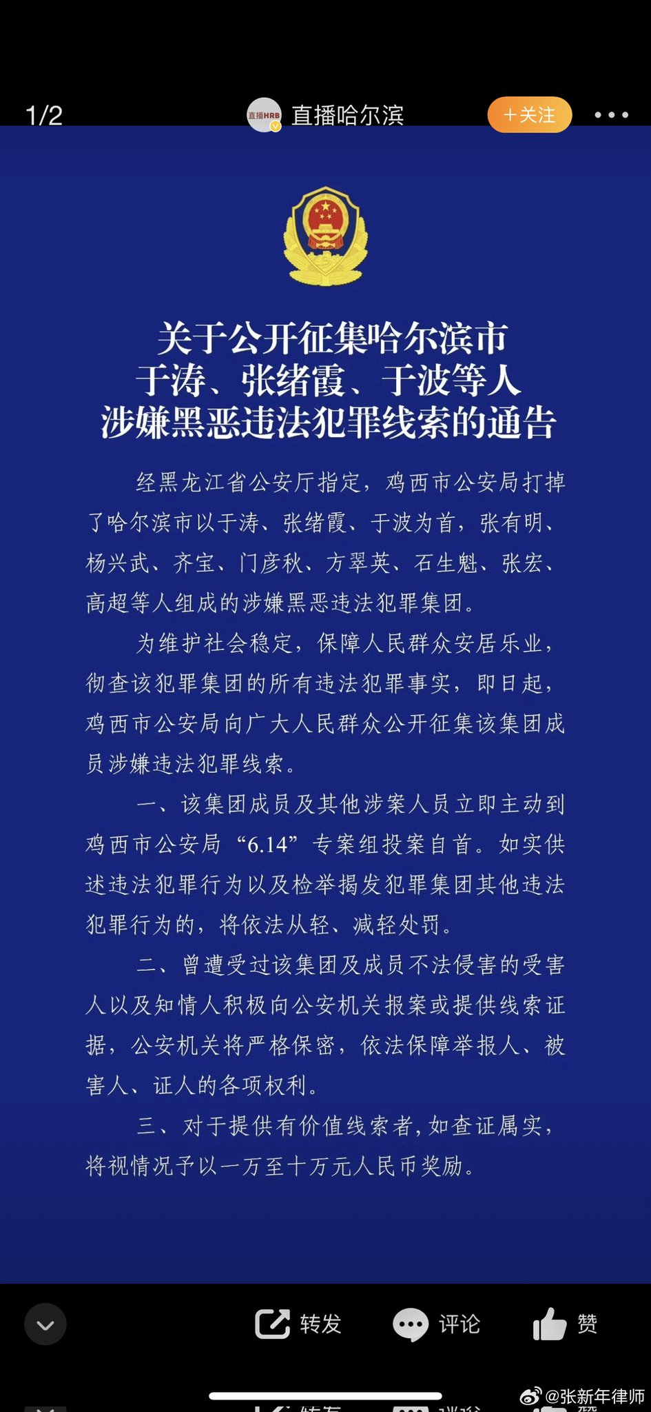 网友质问:哈尔滨市公安局原副局长于涛竟然是黑社会老大?