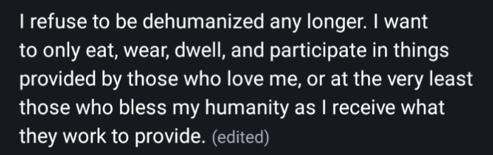 "I refuse to be dehumanized any longer. I want to only eat, wear, dwell & participate in things provided by those who love me or at least bless my humanity."