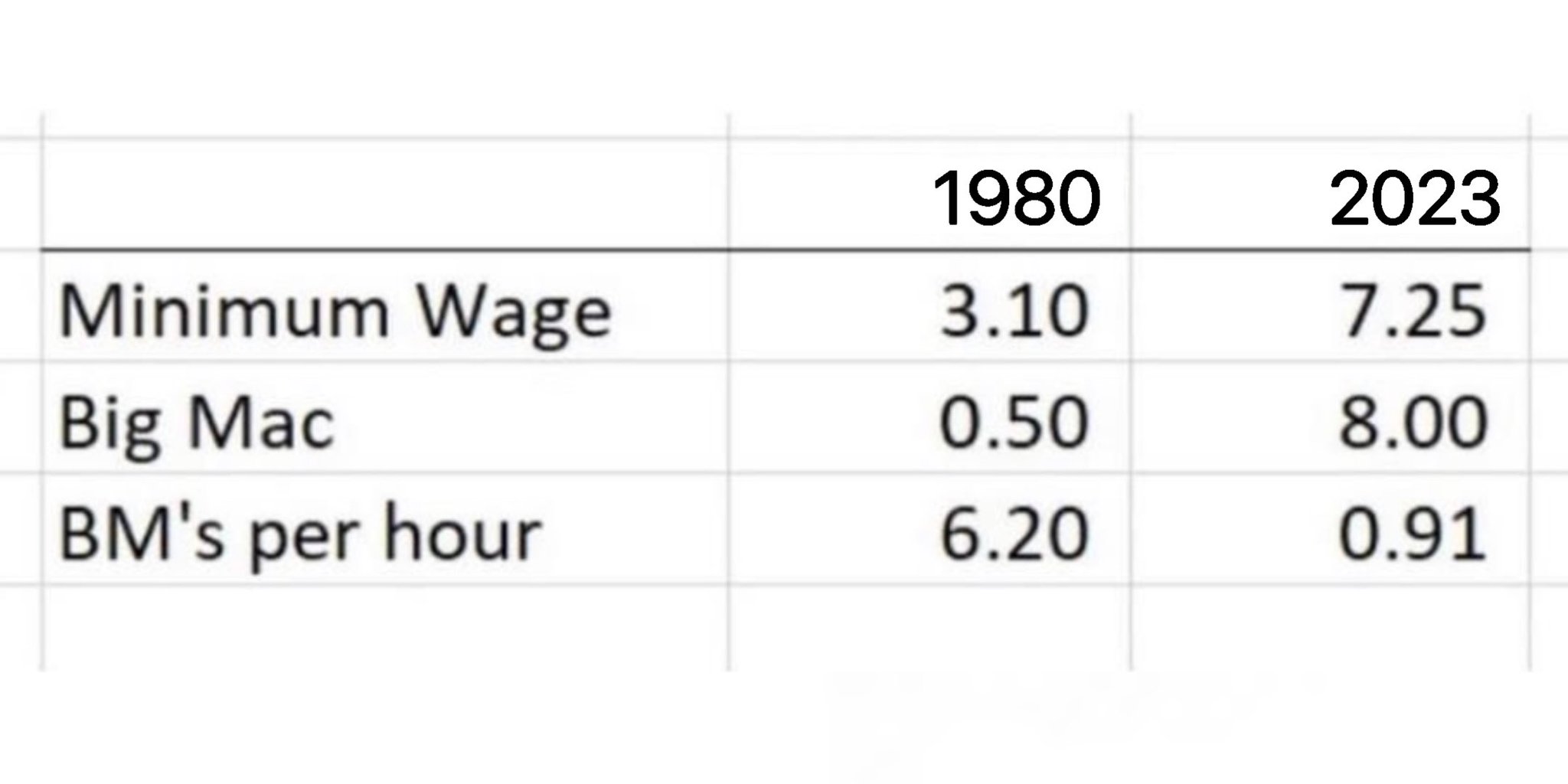 Biggest indicator of US decline: You could buy 6 BigMacs with 1 hour of minimum wage in 1980, but today you can’t even buy one, despite minimum w...