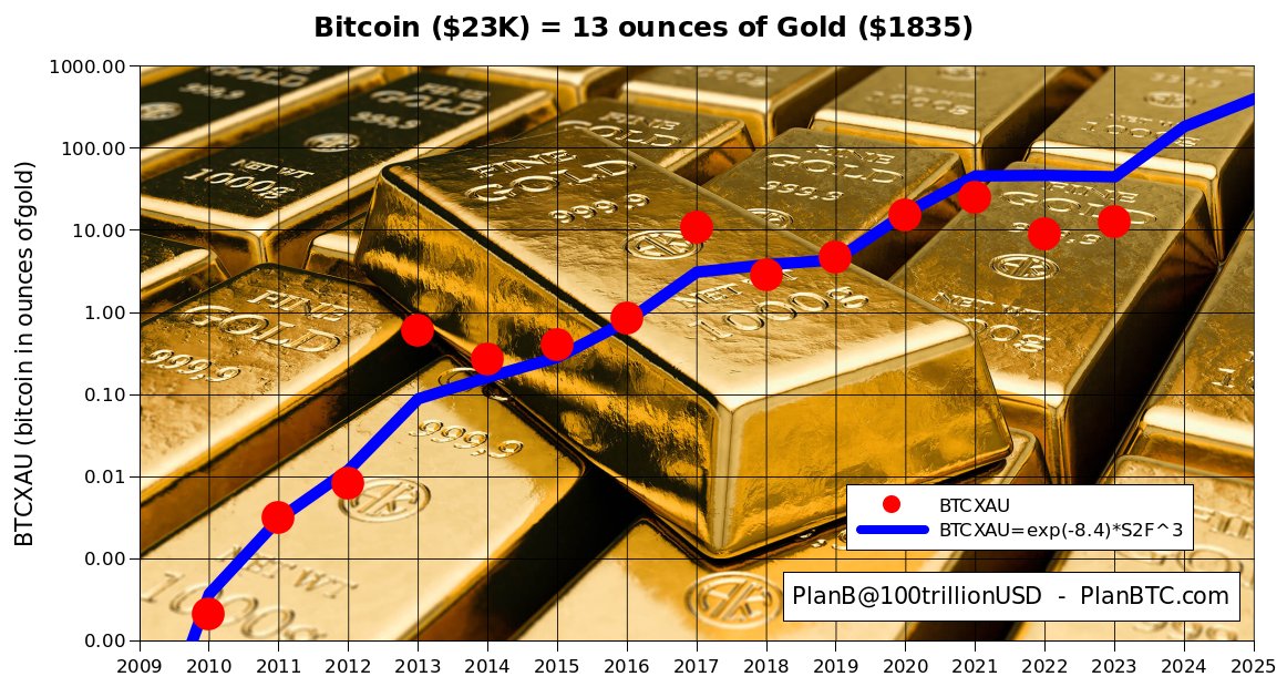 SultanSatoshi 2 years ago X (formerly Twitter)PlanB (@100trillionUSD) on X#Bitcoin = 13 ounces of Gold