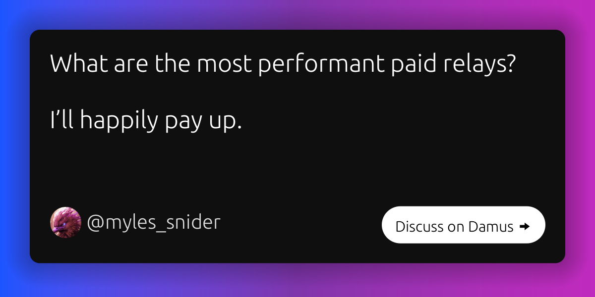 Heyo everyone, looking for a performant paid nostr relay, that I can rel(a)y on ... 🥁 Best answer gets 5000 sats! Thanks 🙏 [18 comments]
