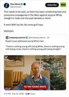 โElon Musk agrees with Rupert Lowe and says โENOUGHโ to โUNRELENTING HATE and POISONOUS PROPAGANDAโ against white, straight men.โ