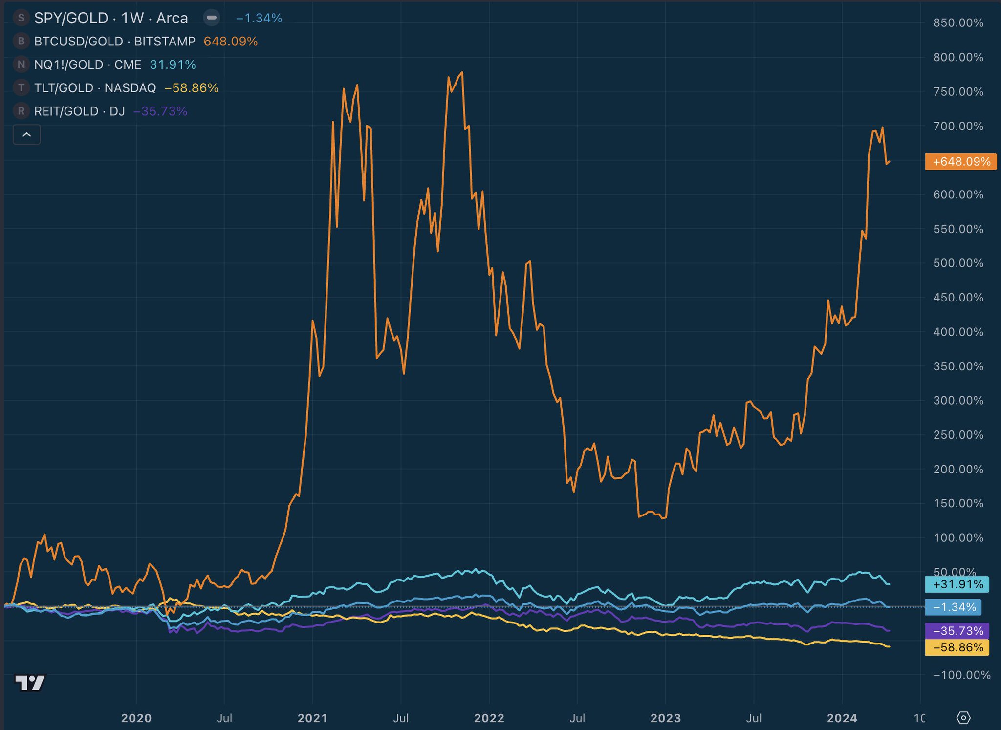 Major asset performance vs Gold over the past 5 years: