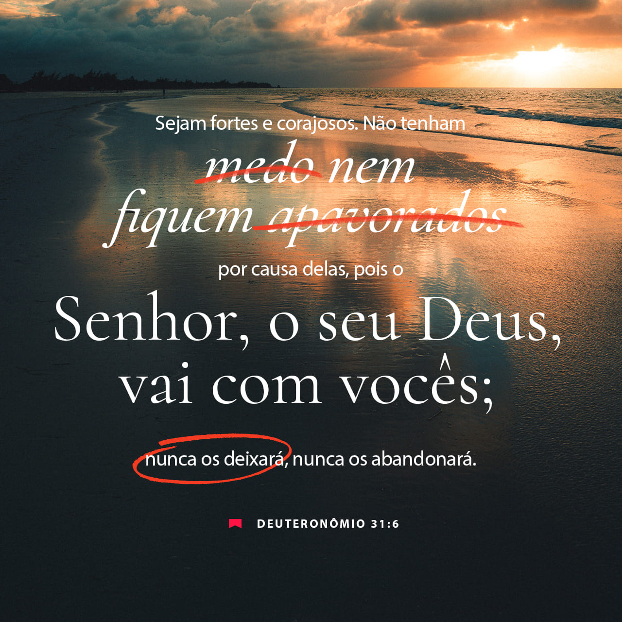 Sejam fortes e corajosos; não se assustem, nem tenham medo deles, pois é o SENHOR, nosso Deus, quem irá com vocês. Ele não os deixará, nem ab...