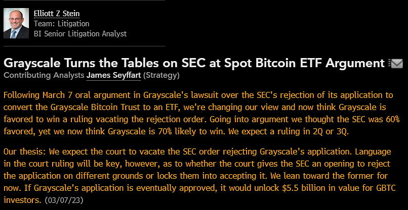 ChewyBTC 2 years ago X (formerly Twitter)Bitcoin Magazine (@BitcoinMagazine) on XBREAKING: 🇺🇸 US Court likely to overturn SEC denial of Grayscale spot #Bitcoin ETF - Bloomberg Intelligence. This could "unlock $5.5 billion...
