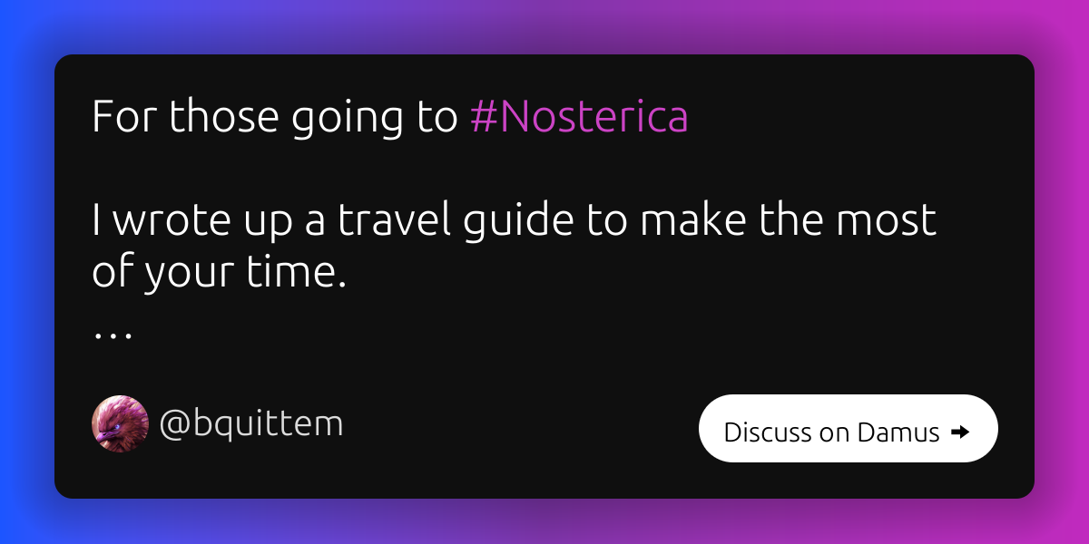 Nostrica Travel Tips - Costa Rica 2023 Brandon Quittem @bquittem Npub1jdwujjpaxmeyg44fz5xa87yhtrnvg8lzqnv9hprk5sdkx6h58gjqwtujzl Should you tr...