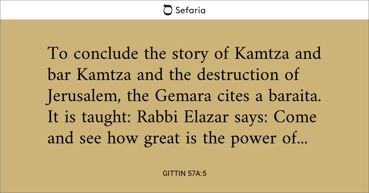 To conclude the story of Kamtza and bar Kamtza and the destruction of Jerusalem, the Gemara cites a baraita. It is taught: Rabbi Elazar says: Come ...