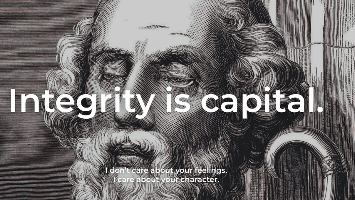 mydogisahusky 2 years ago Integrity is capital. Integrity is capitalI don't care about your feelings. I care about your character.