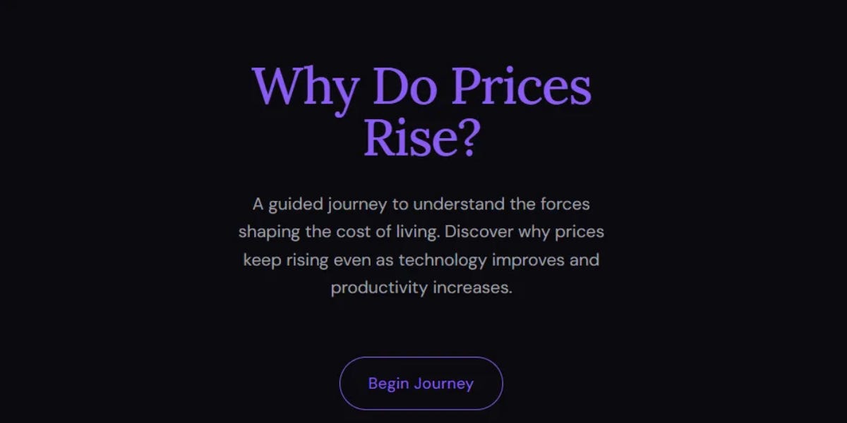 The app is intentionally simple. One idea per screen. No charts designed to impress. Just a logical path that shows why the natural state of a productive society should be falling prices and a higher quality of life and why we experience the opposite.