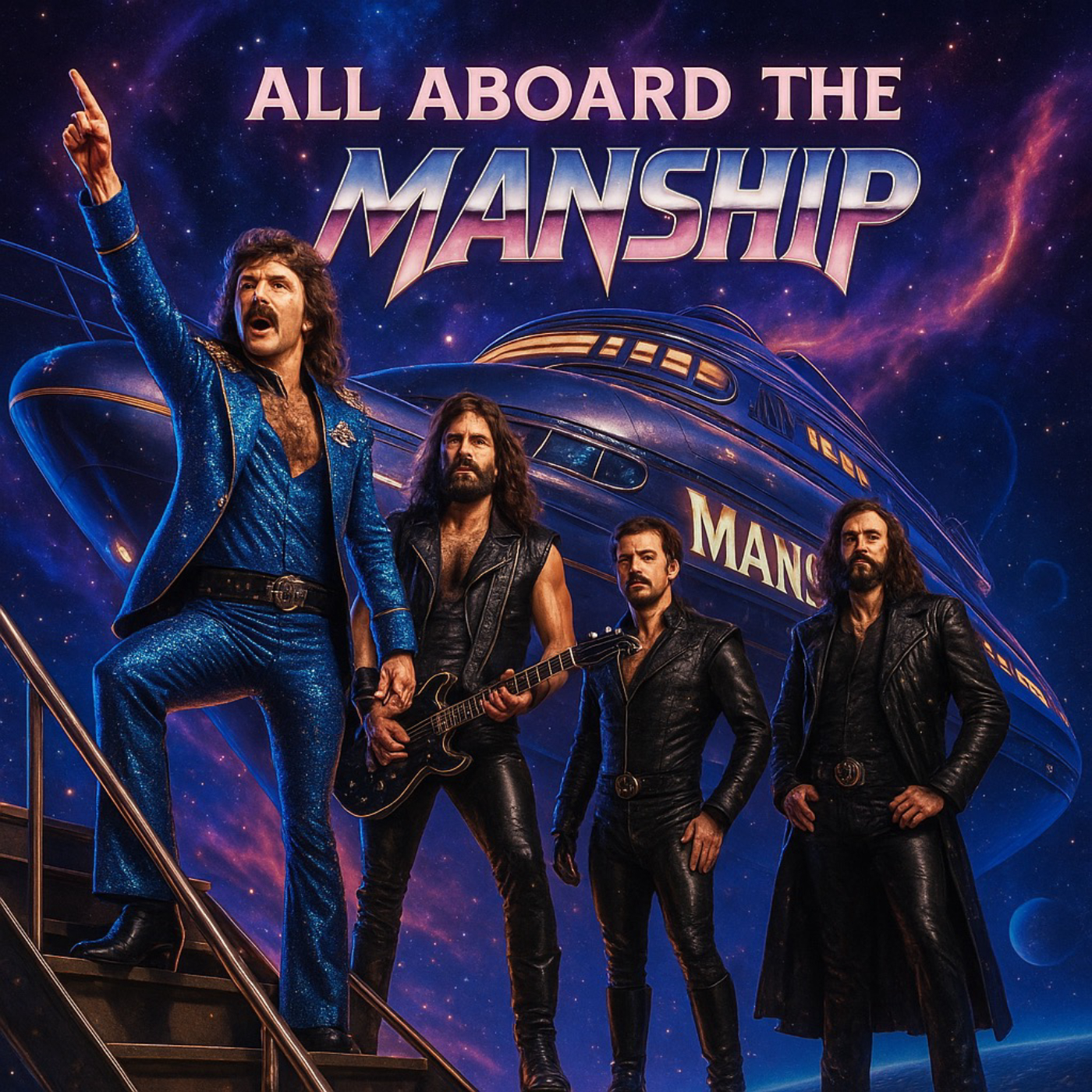We're bringing theatrical space anthems that absolutely RULE - operatic vocals, face-melting guitars, and cheeky cosmic innuendos this side of the Milky Way. Our new album "All Aboard the Manship" is ready to take you on an epic interstellar voyage through black holes, wormholes, and everything in between.
