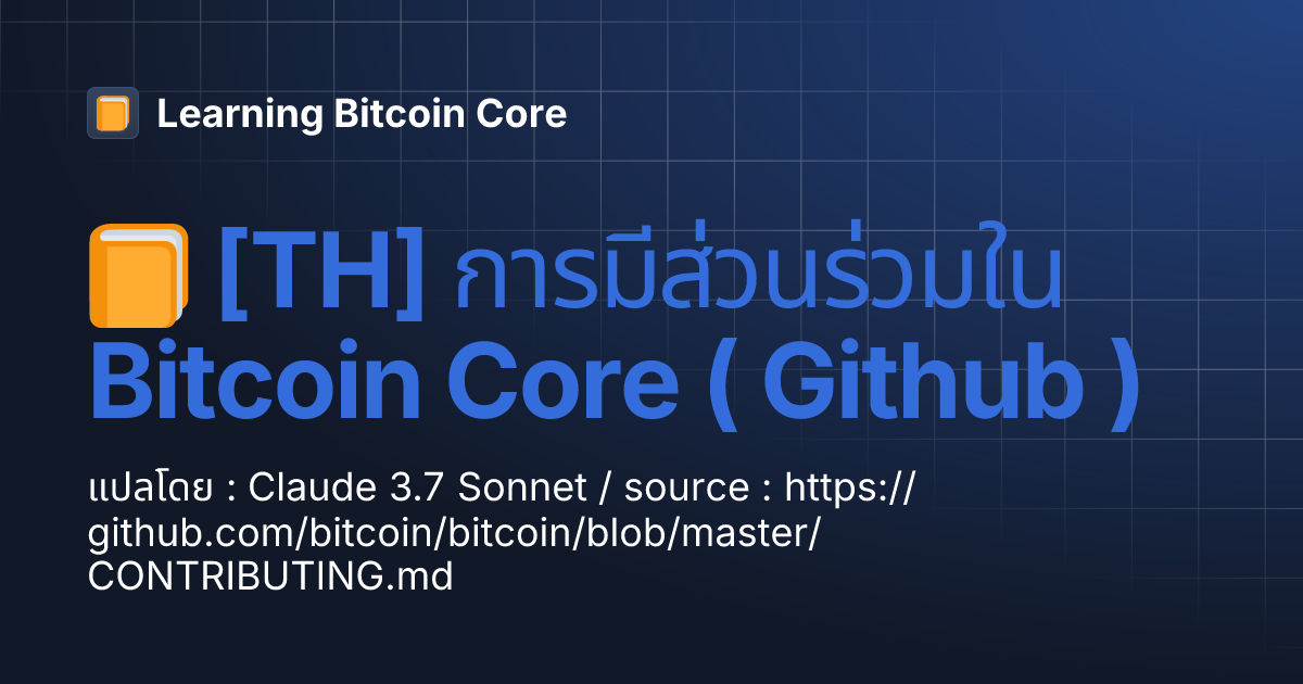 satuser 9 months ago 📙 [TH] การมีส่วนร่วมใน Bitcoin Core ( Github ) | Learning Bitcoin Coreแปลโดย : Claude 3.7 Sonnet / source : https://github.com/bitcoin/bitcoin/blob/master/CONTRIBUTING.md แปลไว้กก่อน เดี๋ยวมาอ่าน #learn #bitcoincore #thai #readme #siamstr #siamdev