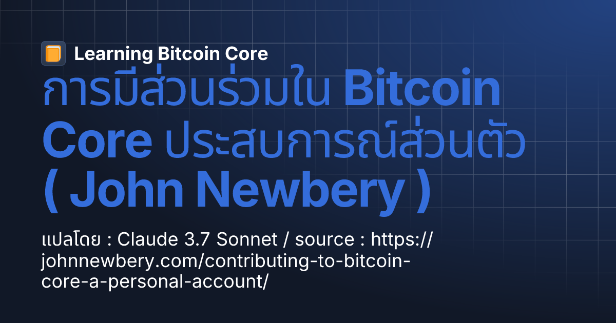 satuser 9 months ago เป็นผู้มีส่วนร่วม ไม่ใช่นักพัฒนา การมีส่วนร่วมใน Bitcoin Core ประสบการณ์ส่วนตัว ( John Newbery ) | Learning Bitcoin Coreแปลโดย : Claude 3.7 Sonnet / source : https://johnnewbery.com/contributing-to-bitcoin-core-a-personal-account/ #JohnNewbery เป็นนักพัฒนาซอฟต์แวร์โอเพ่นซอร์สที่มีบทบาทสำคัญในวงการ Bitcoin โดยเฉพาะกับโครงการ Bitcoin Core ซึ่งเป็นซอฟต์แวร์หลักที่ใช้ในการดำเนินการของเครือข่าย Bitcoin บทบาทและความสำคัญของ John Newbery • นักพัฒนา Bitcoin Core: ตั้งแต่ปี 2016 John ได้มีส่วนร่วมในการพัฒนาและปรับปรุงซอฟต์แวร์ Bitcoin Core โดยมีบทความและคำแนะนำเกี่ยวกับการปรับปรุงฟีเจอร์ต่างๆ เช่น การประมาณค่าธรรมเนียมและการสนับสนุนกระเป๋าเงินหลายใบ • ผู้ก่อตั้ง Bitcoin Optech: ในปี 2018 เขาร่วมก่อตั้ง #BitcoinOptech เพื่อช่วยให้บริษัทต่างๆ นำเทคโนโลยีการปรับขนาดของ Bitcoin มาใช้ได้อย่างมีประสิทธิภาพ  • ผู้ก่อตั้ง Brink: ในปี 2020 John ร่วมก่อตั้ง #Brink ซึ่งเป็นองค์กรไม่แสวงหาผลกำไรที่มุ่งเน้นการสนับสนุนและฝึกอบรมนักพัฒนา Bitcoin รุ่นใหม่ โดยมีโปรแกรมทุนและการให้คำปรึกษาเพื่อส่งเสริมการพัฒนาโปรโตคอล Bitcoin  • ผู้ริเริ่ม PR Review Club: เขาเริ่มต้น #PRReviewClub ซึ่งเป็นกิจกรรมประจำสัปดาห์ที่ช่วยให้นักพัฒนาร่วมกันตรวจสอบและทดสอบการเปลี่ยนแปลงในโค้ดของ #BitcoinCore ทำให้กระบวนการพัฒนาเปิดกว้างและเข้าถึงได้มากขึ้นสำหรับผู้ที่สนใจ  บทสรุป John Newbery เป็นบุคคลสำคัญที่มีบทบาทในการพัฒนาและส่งเสริมชุมชนนักพัฒนา Bitcoin อย่างต่อเนื่อง ผ่านการมีส่วนร่วมในโครงการหลัก การก่อตั้งองค์กรสนับสนุน และการสร้างกิจกรรมที่เปิดโอกาสให้ผู้ที่สนใจเข้ามามีส่วนร่วมในกระบวนการพัฒนา Bitcoin หากคุณสนใจเรียนรู้เพิ่มเติมเกี่ยวกับผลงานของเขา สามารถเยี่ยมชมเว็บไซต์ส่วนตัวของเขาได้ที่ johnnewbery.com หรือเว็บไซต์ของ Brink ที่ brink.dev #siamstr #siamdev #learningbitcoincore #bitcoiner #ClaudeStr : แปล #ChatgptStr : caption แนะนำ