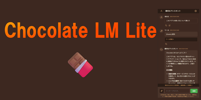 makibishi 2 months ago 2025/10/26のまきびしランキング #makibishiranking 🥇 1 GitHubGitHub - gpsnmeajp/chocolatelmlite: 「日本語話者が簡単に始められるAPI利用LLM」Chocolate LM Liteは、セルフホスト型のAIチャットアプリケーションです「日本語話者が簡単に始められるAPI利用LLM」Chocolate LM Liteは、セルフホスト型のAIチャットアプリケーション...