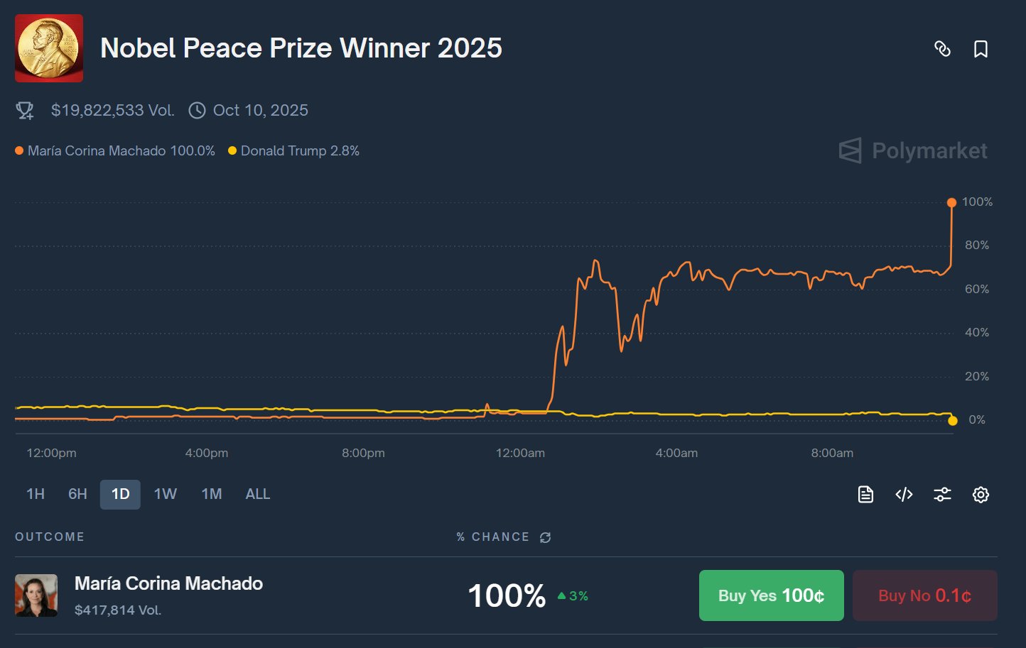 A Polymarket user figured out who won the Nobel Peace Prize almost 11 hours before the official announcement from the Nobel Committee.