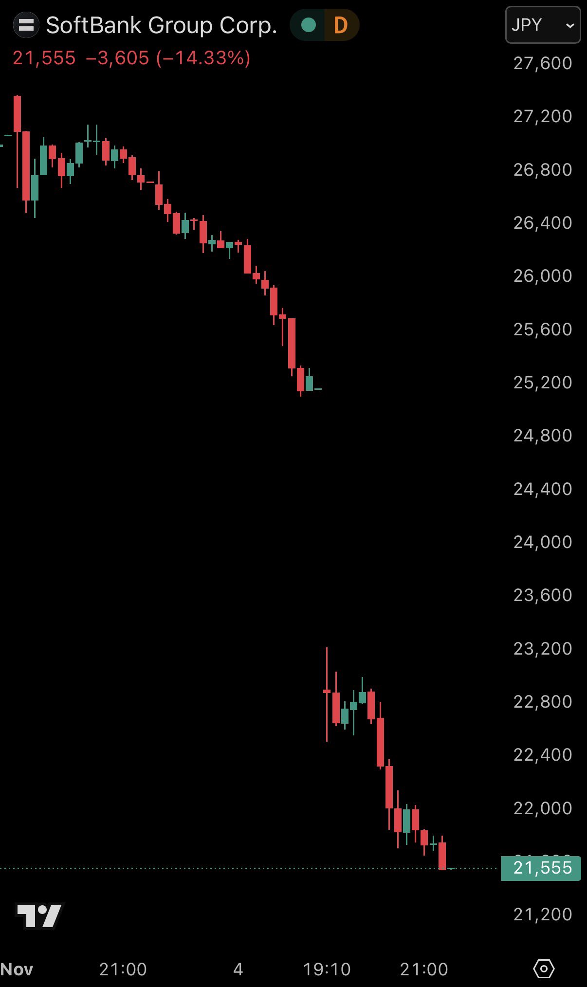 BREAKING: Japan’s SoftBank stock is now down -15% on the day, extending its two-day decline to -22%.