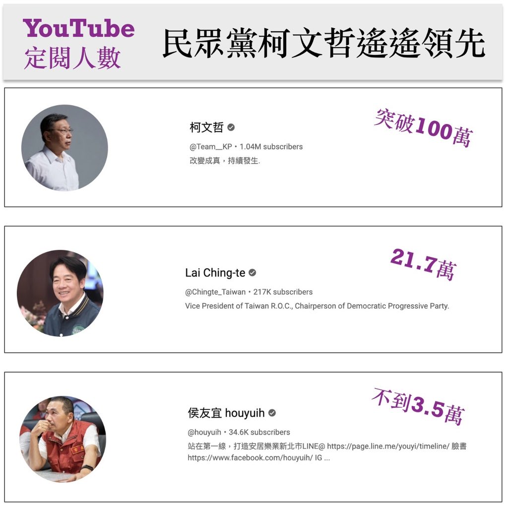 柯文哲的订阅数快追上王局了,了不起。