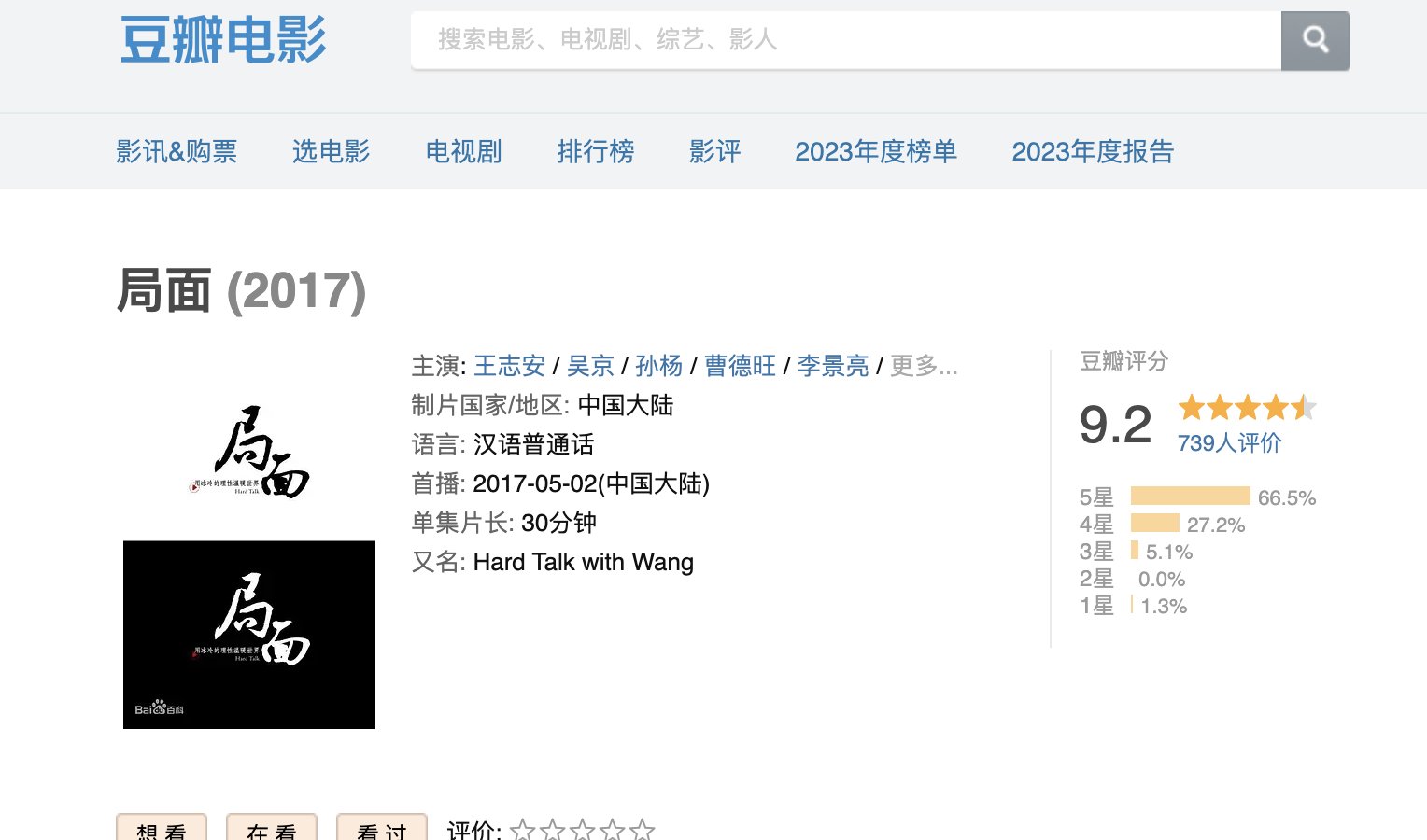 豆瓣对我当年在国内做的局面节目一直有打分,我们节目停播后,分数有所下降,但依然维持在9分之上。