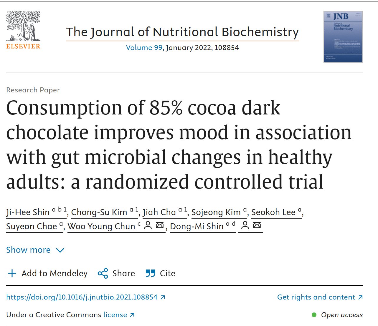 要点はシンプルで、85%のダークチョコが腸内細菌の多様性を高めて、幸せホルモンの材料を作る環境を整えた、という話。