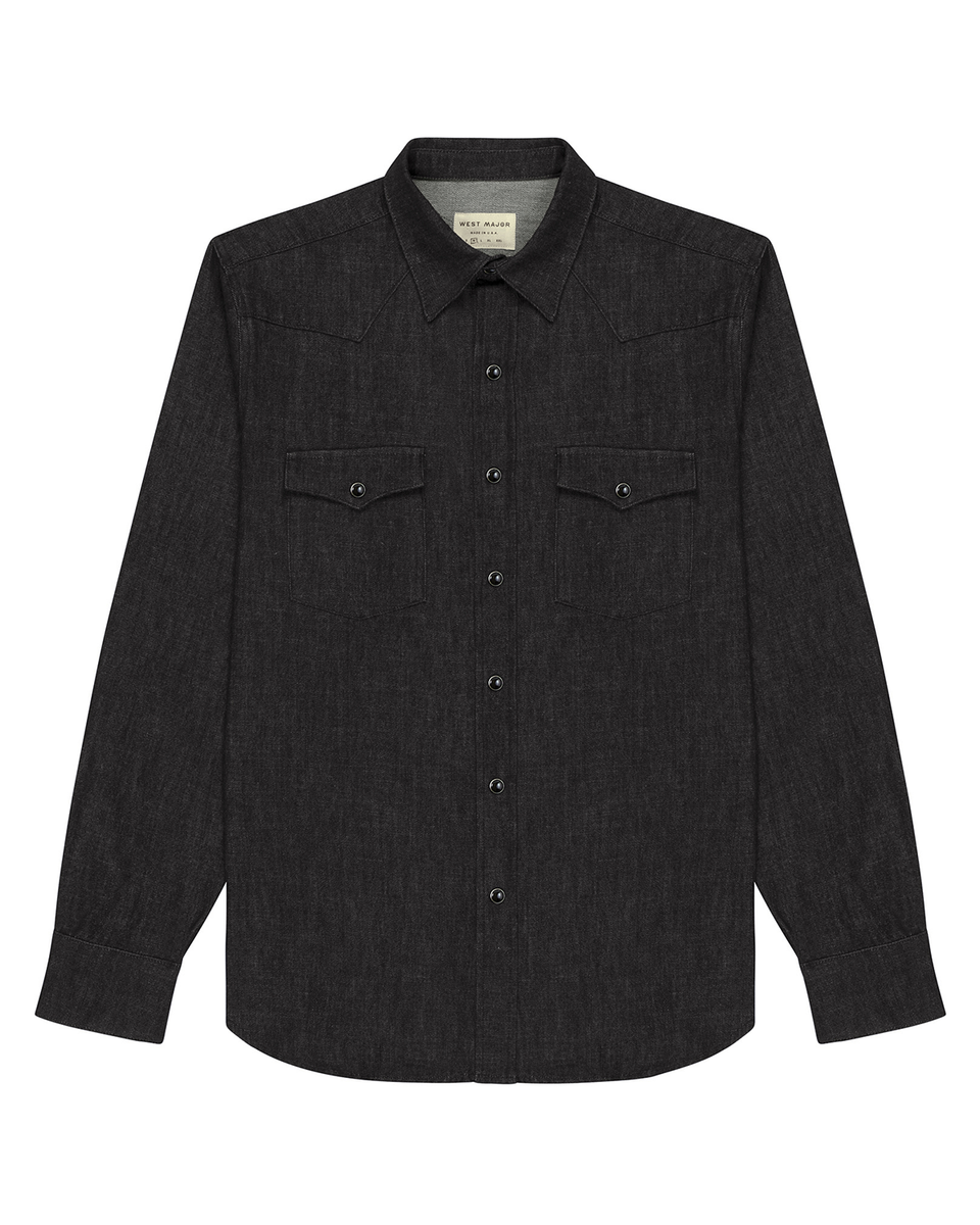Black denim western shirt made from 100% Japanese denim. Fabric is pre-washed. Slim fit. Long sleeve western shirt with black snaps.