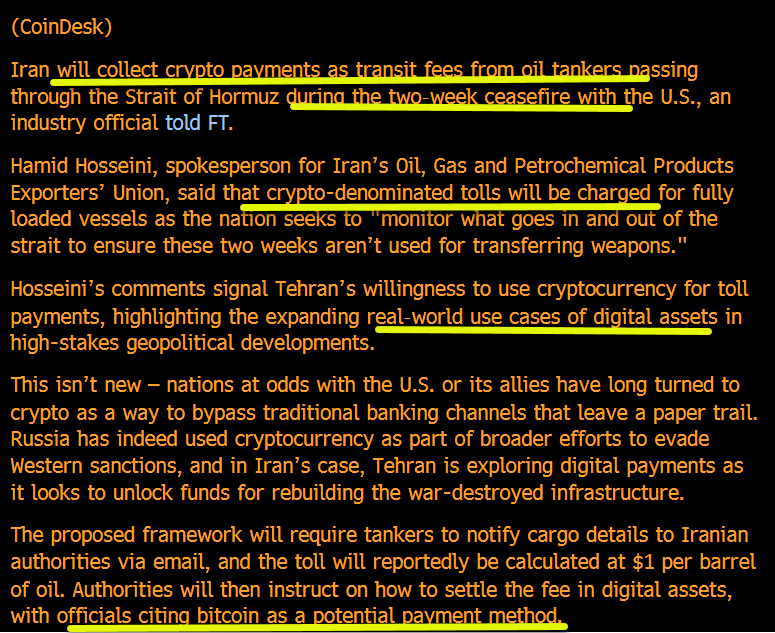 chrizzz 1 week ago X (formerly Twitter)matthew sigel, recovering CFA (@matthew_sigel) on Xπ¨Iran to collect Bitcoin as payment for Hormuz passage: FT