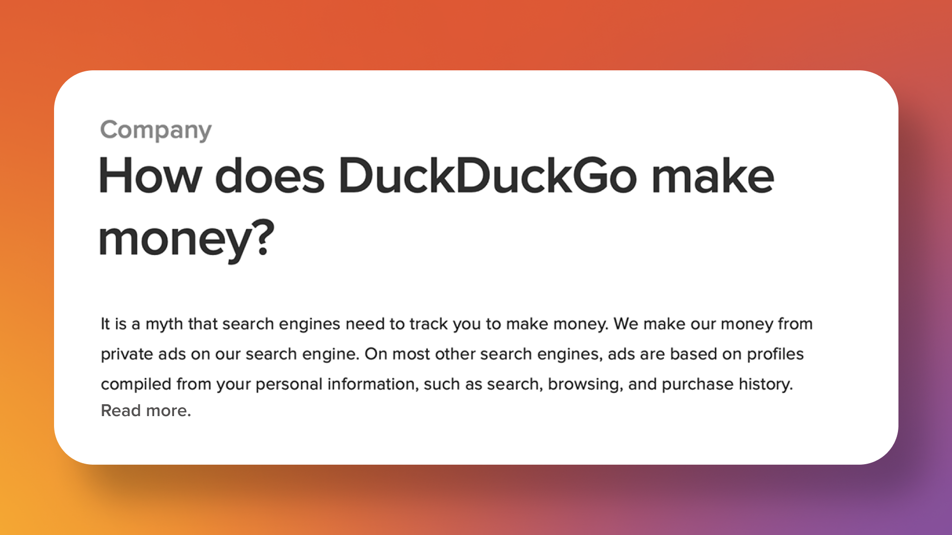 Kendy 1 year ago How does DuckDuckGo make money? - DuckDuckGo Help PagesDuckDuckGo makes money from private ads on our search engine and from subscription fees for our Privacy Pro subscription service.