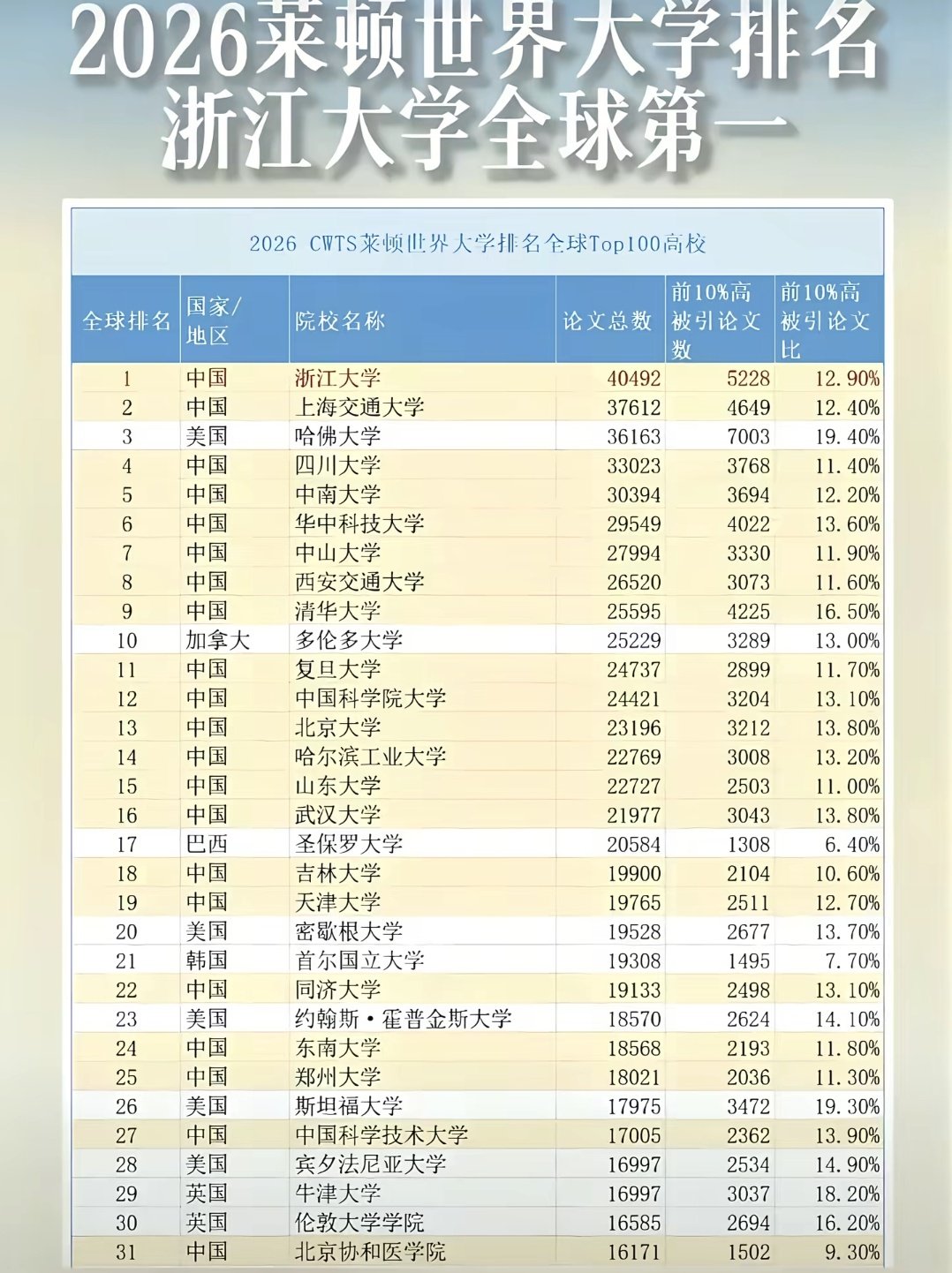 2026年莱顿世界大学排名,浙大全球第一,上交全球第二,