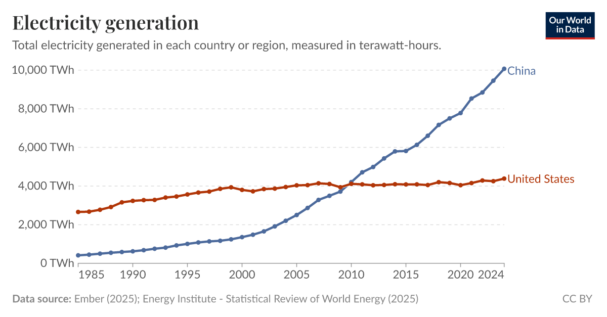 They have 4x the population we do, and are industrializing and manufacturing. They only produce 2.5x the electricity. Let me know where they are in 25 years