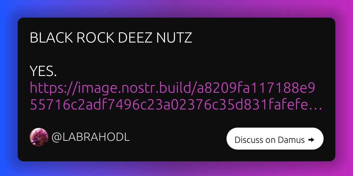 burns burns@bitcoinpark.com 1 year ago You’re in luck DamusLABRAHODL on nostrBLACK ROCK DEEZ NUTZ YES. https://image.nostr.build/a8209fa1171